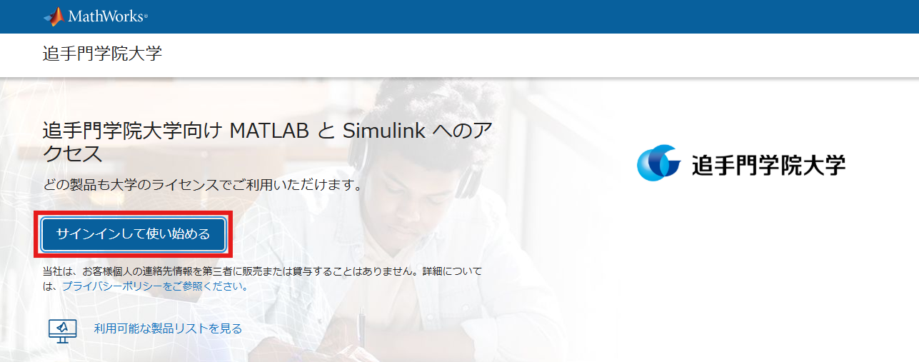「 @otemon.ac.jp」メールアドレスで登録された MathWorks アカウントは本学のサイトライセンス( Campus-Wide )に自動的に紐づけられ利用可能となります。アカウント作成のマニュアルは、スタートアップガイドの p8「 MathWorks アカウントの新規作成」をご参考ください。