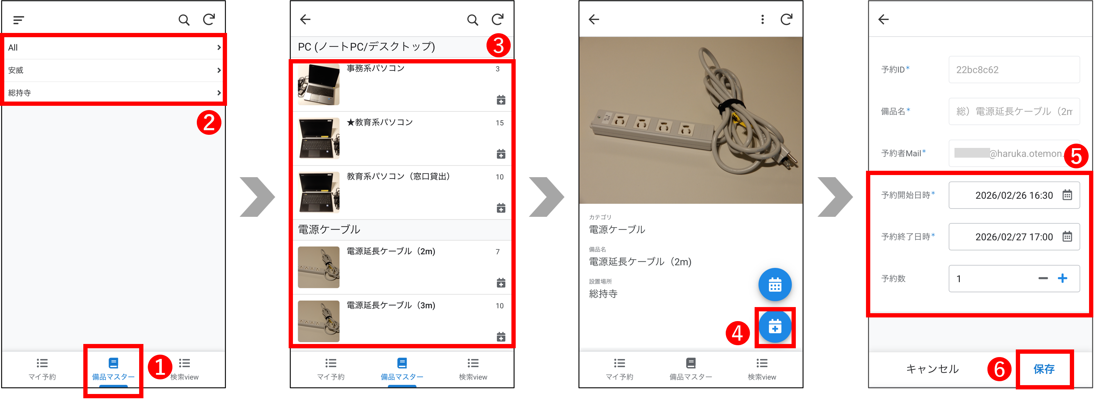 ・備品マスター>キャンパスの選択>備品の選択>右下の+をタップ>予約開始日時・予約終了日時・予約数を入力>保存